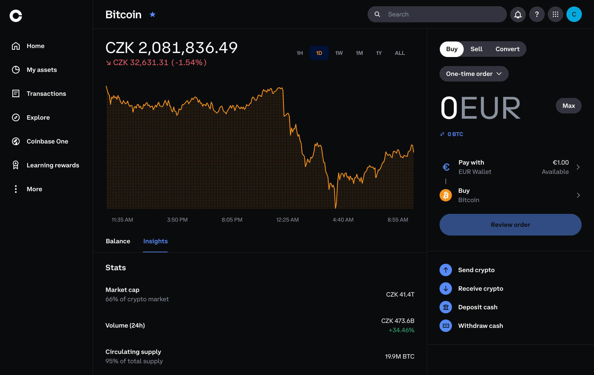 Coinbase je populární kryptoměnová platforma, která umožňuje nákup nebo prodej kryptoměn za EUR. Dále Coinbase nabízí také bezplatnou úschovu kryptoměn, obchodování kryptonových derivátů nebo například úročení kryptoměn pomocí stakingu.