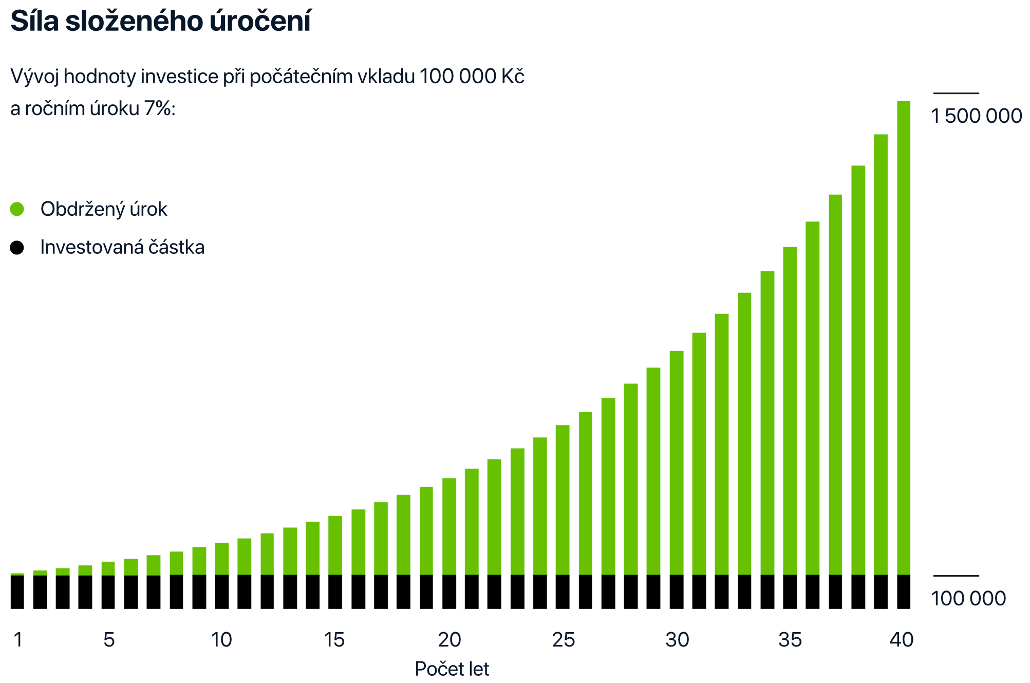 Složené úročení má ohromnou sílu, protože úročená částka (a tím pádem i úroky) rostou exponenciálně. Klíčovým faktorem je ale čas – čím déle tedy spoříte, tím větší bude výsledný efekt.
