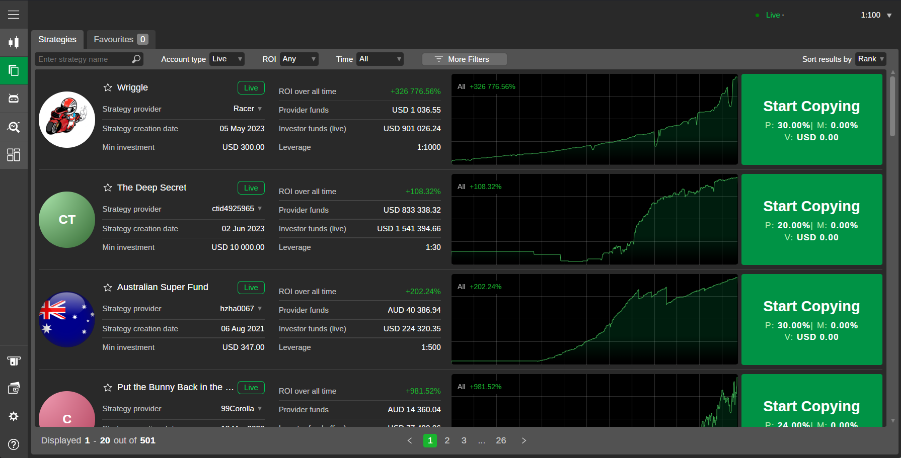 Kopírování obchodníků je na první pohled jednoduchá cesta k penězům, ale nenechte se zmást. Nejziskovější obchodníci využívají vysoce rizikové strategie nebo extrémně vysokou páku, takže jejich strategie se během chvilky mohou proměnit v past. Ke kopírování navíc potřebujete stovky nebo tisíce dolarů, takže riziko je opravdu vysoké!