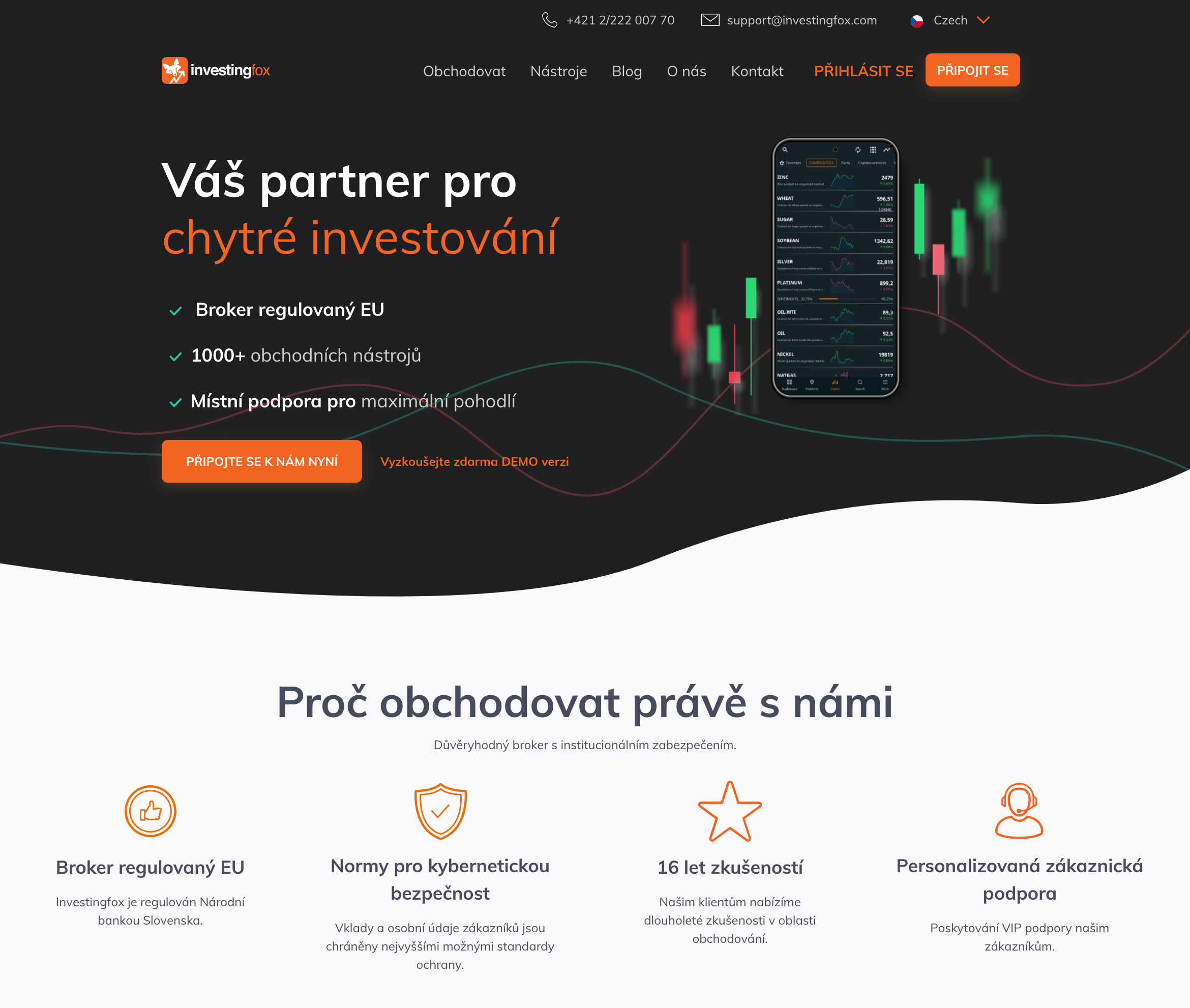 Výhodou Investing Fox je podpora češtiny a možnost vedení účtu v korunách. Obchodování si navíc můžete bez rizika vyzkoušet přes testovací účet.