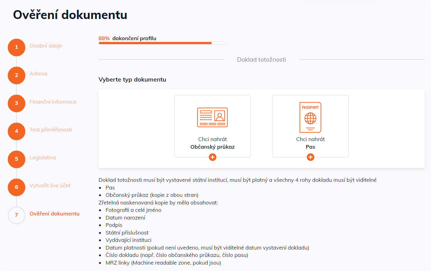 V posledním kroku broker vyžaduje ověření totožnosti. K tomu budete potřebovat 2 doklady totožnosti, které podle instrukcí nafotíte a nahrajete do klientské zóny. Tento krok lze přeskočit, ale jen dočasně. Pokud totiž svoji totožnost neověříte, broker vám neumožní vybrat peníze.