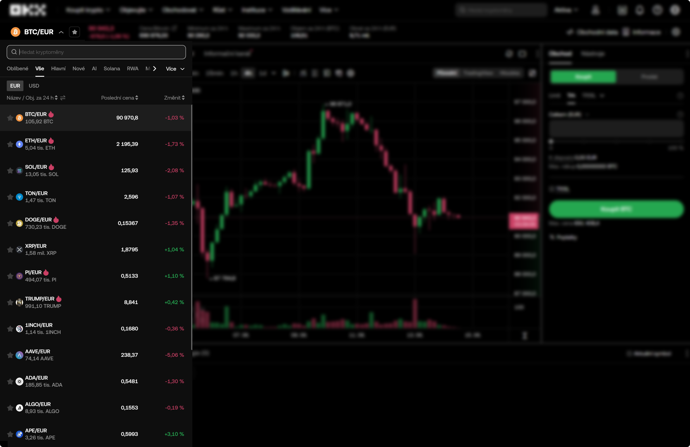 - Nákup, prodej a směna kryptoměn – OKX umožňuje nákup a prodej kryptoměn za klasické peníze (EUR, USD). Vybrané kryptoměny lze také směňovat za BTC, ETH nebo USDC.